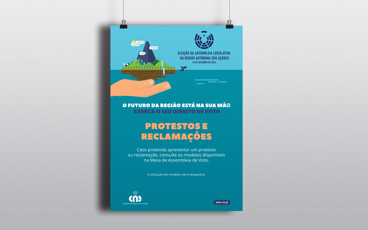 Utilizar uma comunicação transversal com o intuito de abranger todos os segmentos da população votante. Em termos visuais foi utilizada uma linguagem infográfica animada suportada por elementos identitários da RAA. Assim, surgiu sobre um fundo a dois tons de azul – céu e mar – uma ilha sobre uma mão, que representa a responsabilidade de cada um no futuro da região. A complementar a imagem aplicou-se o SLOGAN “O futuro da região está na sua mão”.