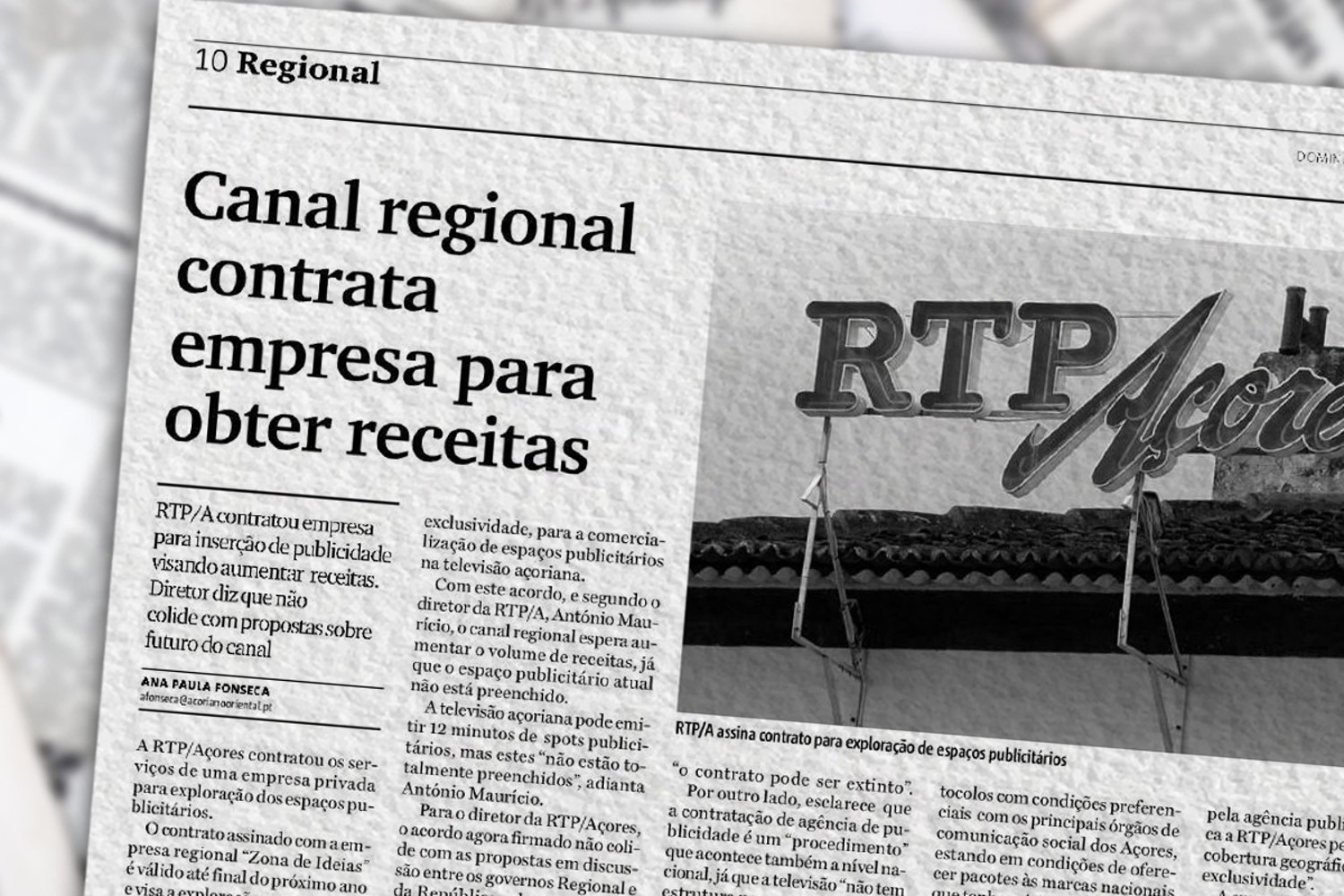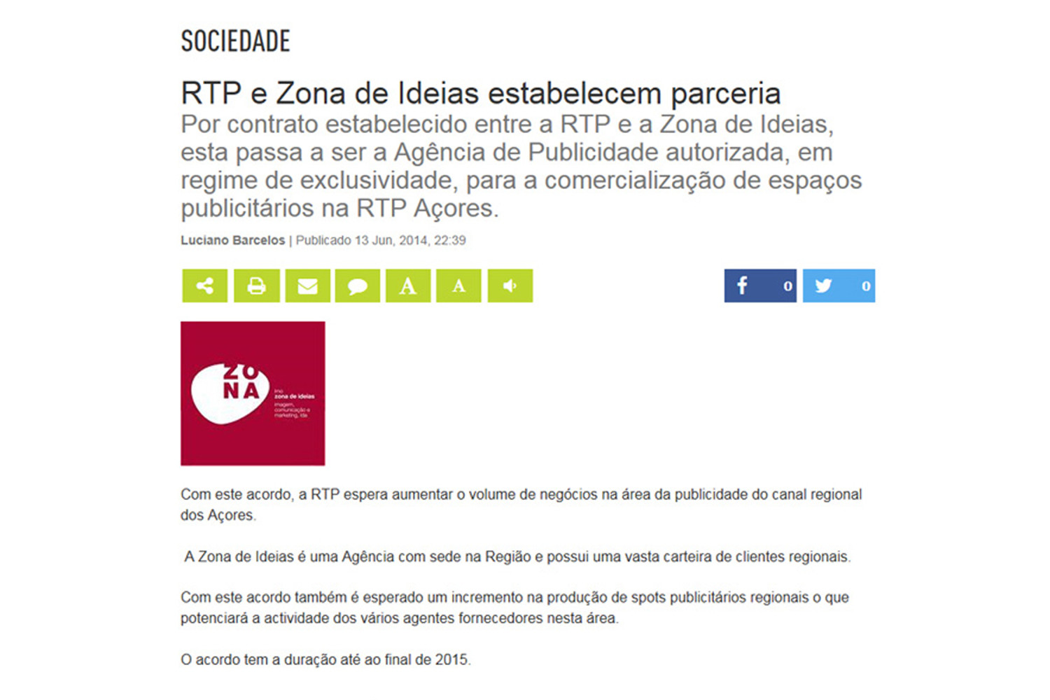 «Com este acordo, a RTP espera aumentar o volume de negócios na área da publicidade do canal regional dos Açores. A Zona de Ideias é uma Agência com sede na Região e possui uma vasta carteira de clientes regionais. Com este acordo também é esperado um incremento na produção de spots publicitários regionais o que potenciará a actividade dos vários agentes fornecedores nesta área».