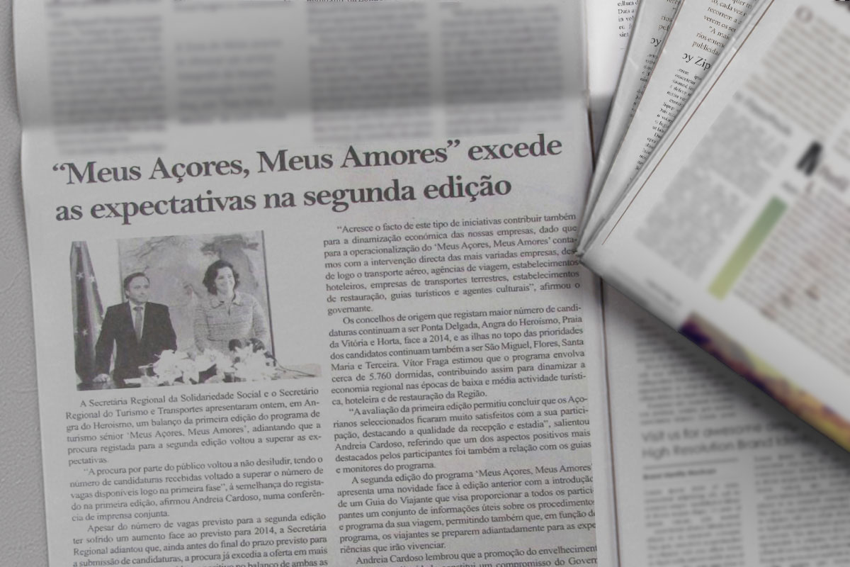 «A Secretária Regional da Solidariedade Social e o Secretário Regional do Turismo e Transportes apresentam ontem, em Angra do Heroísmo, um balanço da primeira edição do programa de turismo sénior 'Meus Açores, Meus Açores' [campanha desenvolvida e produzida pela Zona de Ideias], adiantando que a procura registada para a segunda edição voltou a superar as expectativas.