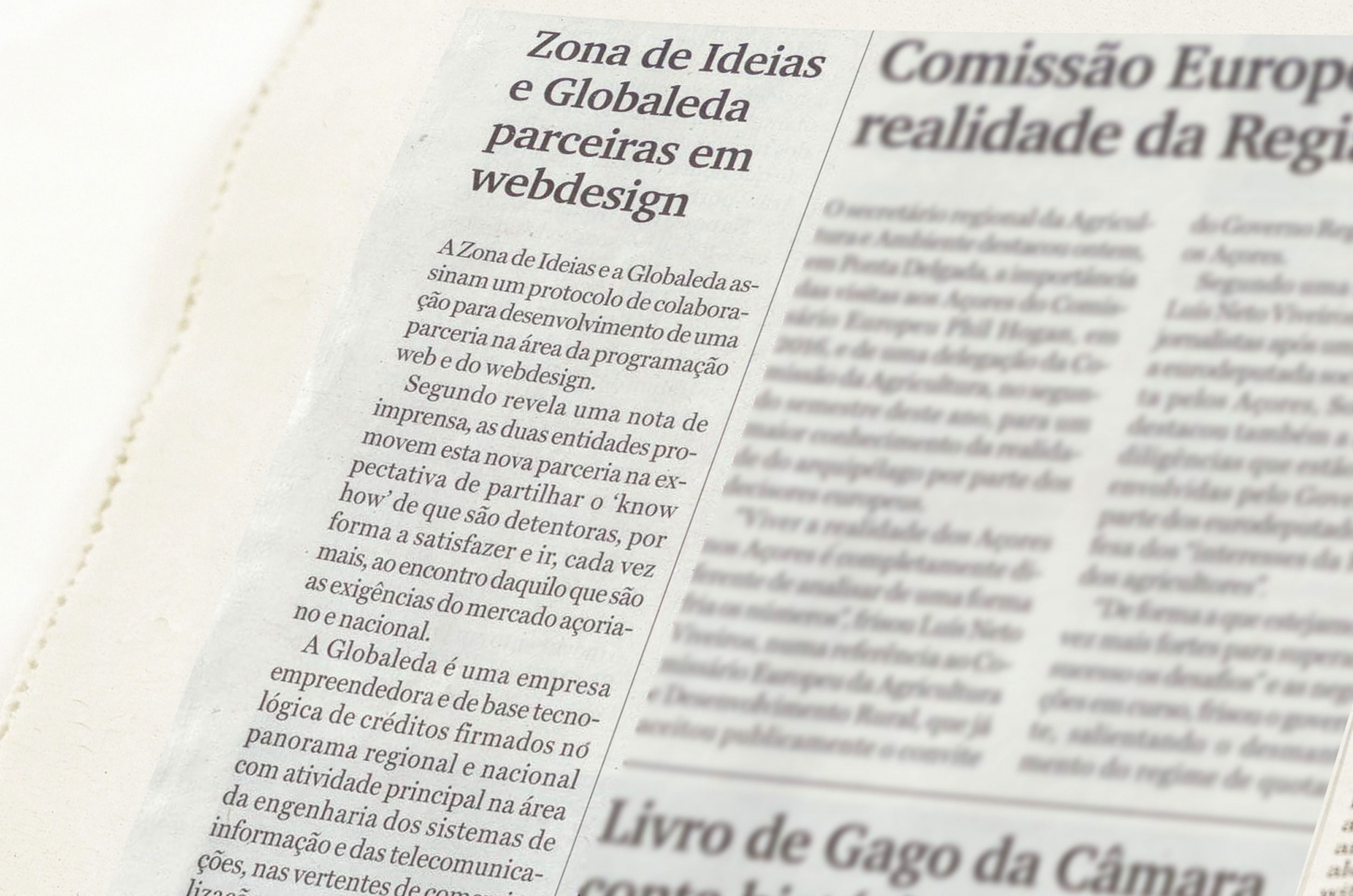 «Zona de Ideias e a Globaleda assinam um protocolo de colaboração para o desenvolvimento de uma parceria na área da programação web e do webdesign. […] As duas entidades promovem esta nova parceria na expetativa de partilhar o 'know how' de que são detentoras, por forma a satisfazer e ir, cada vez mais, ao encontro daquilo que são as exigências do mercado açoriano e nacional».