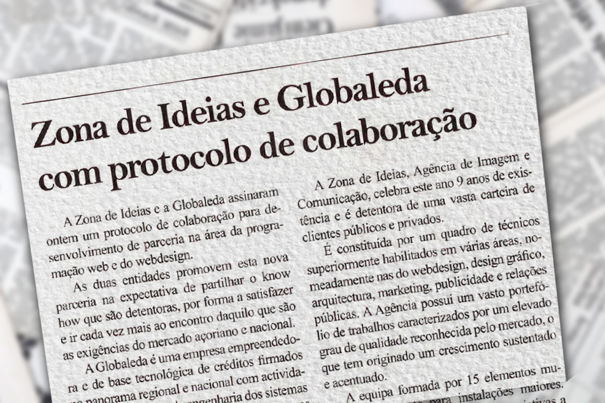 «A Zona de Ideias e a Globaleda assinaram ontem um protocolo de colaboração para desenvolvimento de parceria na área da programação web e webdesign. A Zona de Ideias celebra este ano 9 anos de existência e é detentora de uma vasta carteira de clientes público e privados. [...] A equipa formada por 15 elementos mudou recentemente para instalações maiores. De referir que para além das áreas criativas a agência também faz a gestão e planeamento de meios de comunicação regionais destacando-se a recente parceria em exclusividade com a RTP Açores».