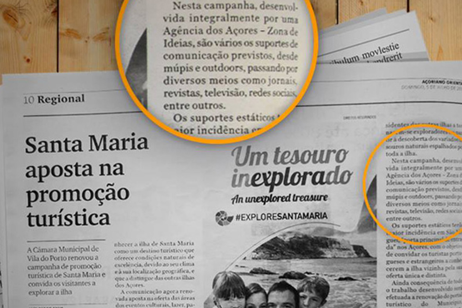 «Com o objetivo de renovar e potenciar a imagem de promoção turística de Santa Maria, o Município de Vila do Porto está a desenvolver um conjunto alargado de ações na área do marketing que visam dar a conhecer a ilha de Santa Maria como um destino turístico que oferece condições naturais de excelência, devido ao seu clima e à sua localização geográfica, que a distingue das outras ilhas dos Açores. [...] A partir de um antigo mote 'Explore Santa Maria', a nova campanha [desenvolvida pela Zona de Ideias] adotou a assinatura 'Um tesouro inexplorado' convidando assim os turistas e os residentes das outras ilhas a tornarem-se exploradores e partirem à descoberta dos vários tesouros naturais espalhados por toda a ilha».