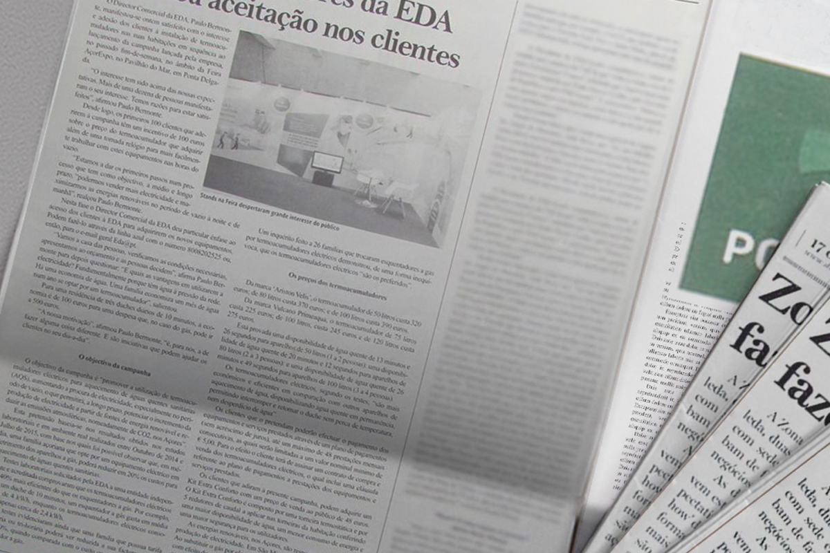 «O Diretor Comercial da EDA, Paulo Bermonte, manifestou-se ontem satisfeito com o interesse e adesão dos clientes à instalação de termoacumuladores nas suas habitações em sequência do lançamento de campanha [desenvolvida pela Zona de Ideias] lançada pela empresa, no passado fim-de-semana, no âmbito da Feira AçorExpo, no Pavilhão do Mar, em Ponta Delgada».
