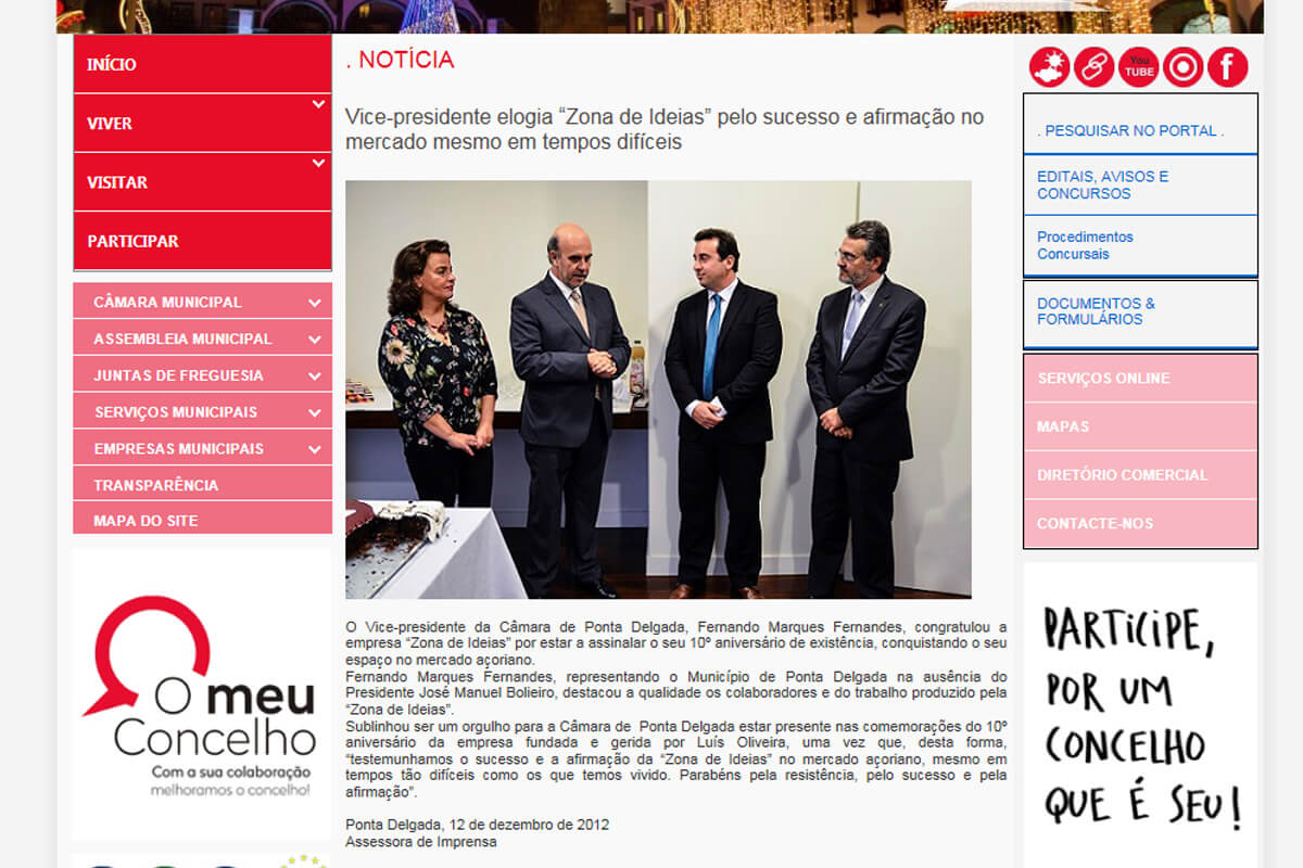 «Fernando Marques Fernandes, representando o Município de Ponta Delgada na ausência do Presidente José Manuel Bolieiro, destacou a qualidade dos colaboradores e do trabalho produzido pela Zona de Ideias. Sublinhou ser um orgulho para a Câmara de Ponta Delgada estar presente nas comemorações do 10º aniversário da empresa fundada e gerida por Luís Oliveira uma vez que, desta forma, “testemunhamos o sucesso e a afirmação da Zona de Ideias no mercado açoriano, mesmo em tempos tão difíceis como os que temos vivido. Parabéns pela resistência, pelo sucesso e pela afirmação”».