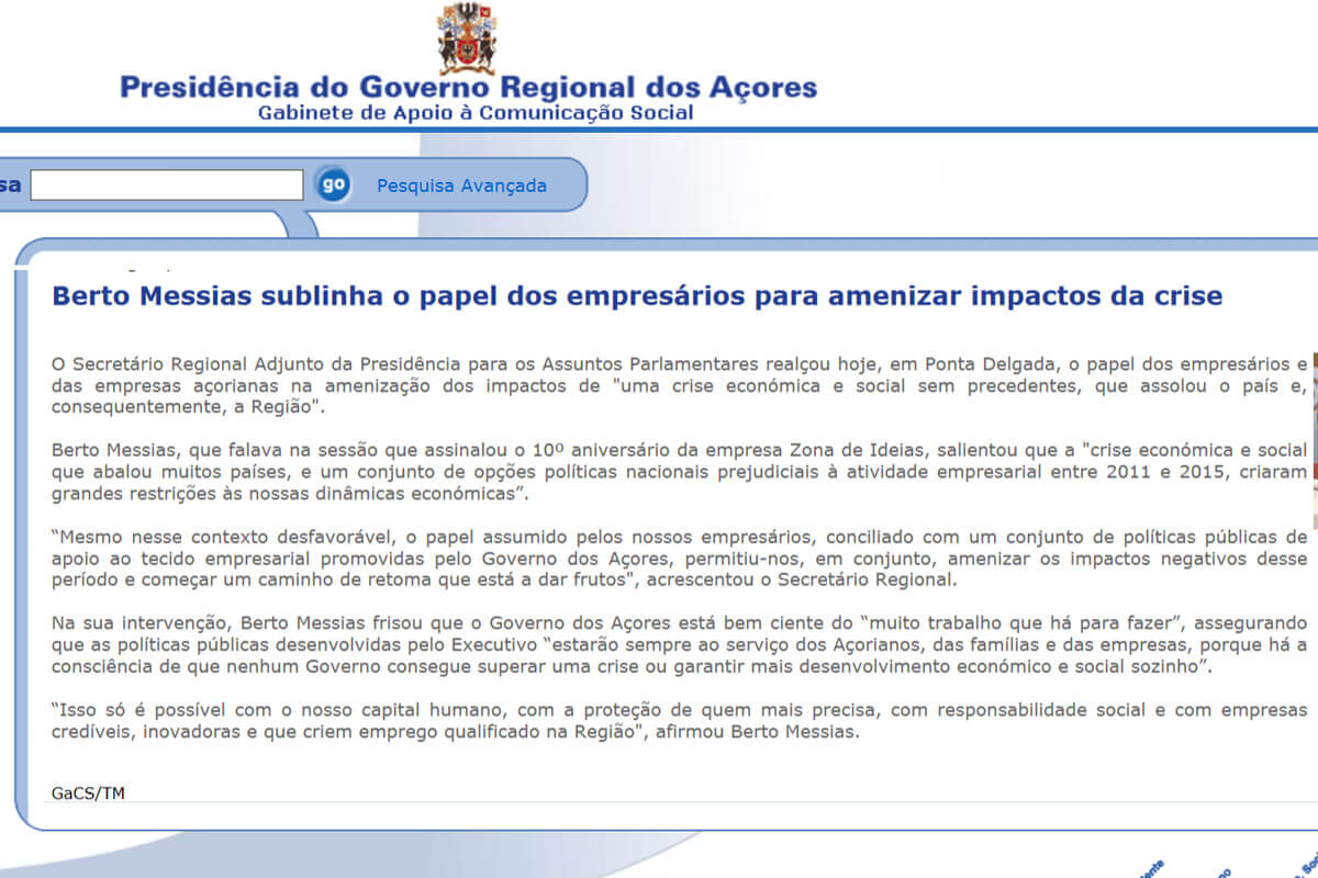 «Berto Messias, que falava na sessão que assinalou o 10º aniversário da empresa Zona de Ideias, salientou que a "crise económica e social que abalou muitos países, e um conjunto de opções políticas nacionais prejudiciais à atividade empresarial entre 2011 e 2015, criaram grandes restrições às nossas dinâmicas económicas”. […] Na sua intervenção, Berto Messias frisou que o Governo dos Açores está bem ciente do “muito trabalho que há para fazer”, assegurando que as políticas públicas desenvolvidas pelo Executivo “estarão sempre ao serviço dos Açorianos, das famílias e das empresas, porque há a consciência de que nenhum Governo consegue superar uma crise ou garantir mais desenvolvimento económico e social sozinho”».