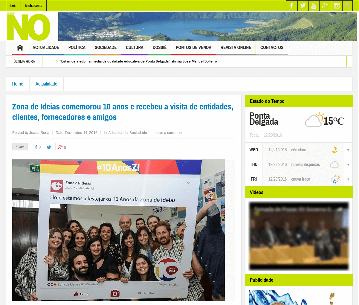 «A agência de imagem, comunicação e marketing – Zona de Ideias – comemorou, dia 12 de Dezembro, 10 anos de actividade. Durante todo o dia, a Zona de Ideias recebeu nas suas instalações mais de uma centena de visitas de entidades, clientes, fornecedores e amigos que brindaram ao seu 10º aniversário, registaram o momento em fotografia e deixaram os seus votos num mural preparado para o efeito».